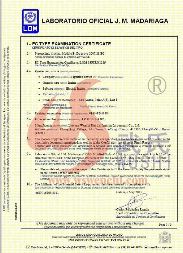 瀏陽市文馳電點(diǎn)火具有限公司(原培文電子點(diǎn)火器材廠),創(chuàng)建于1998年,是一家專業(yè)從事研制銷售電子點(diǎn)火產(chǎn)品的民營科技企業(yè),是我國第1枚煙花用電點(diǎn)火頭生產(chǎn)者,是《煙花爆竹電點(diǎn)火頭國標(biāo)》牽頭起草單位。公司位于中國“煙花之鄉(xiāng)”湖南省瀏陽市,地理位置優(yōu)越,交通便利。 我公司研制的對(duì)象是用電能引燃火藥、做機(jī)械功等預(yù)定功能的一次性使用的元件或裝置,包括電點(diǎn)火頭(英文名ElectricMatch or Electric Igniter,中文俗稱“電火柴”或“電發(fā)火頭”)、電點(diǎn)火管和延期電點(diǎn)火管;我們估且在以后的產(chǎn)品技術(shù)欄中將我們研究的產(chǎn)品統(tǒng)稱為電點(diǎn)火具,將電點(diǎn)火器看成是用于提供和控制供給電點(diǎn)火元件點(diǎn)火的電能器材;我們研究的電點(diǎn)火橋路有橋絲式、無橋絲···